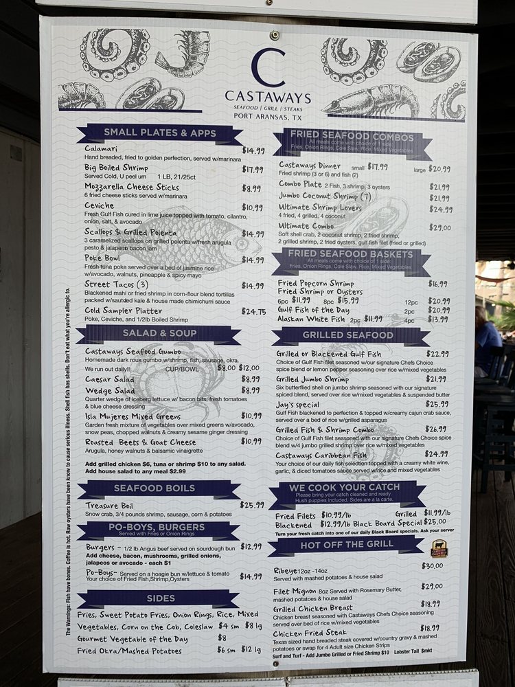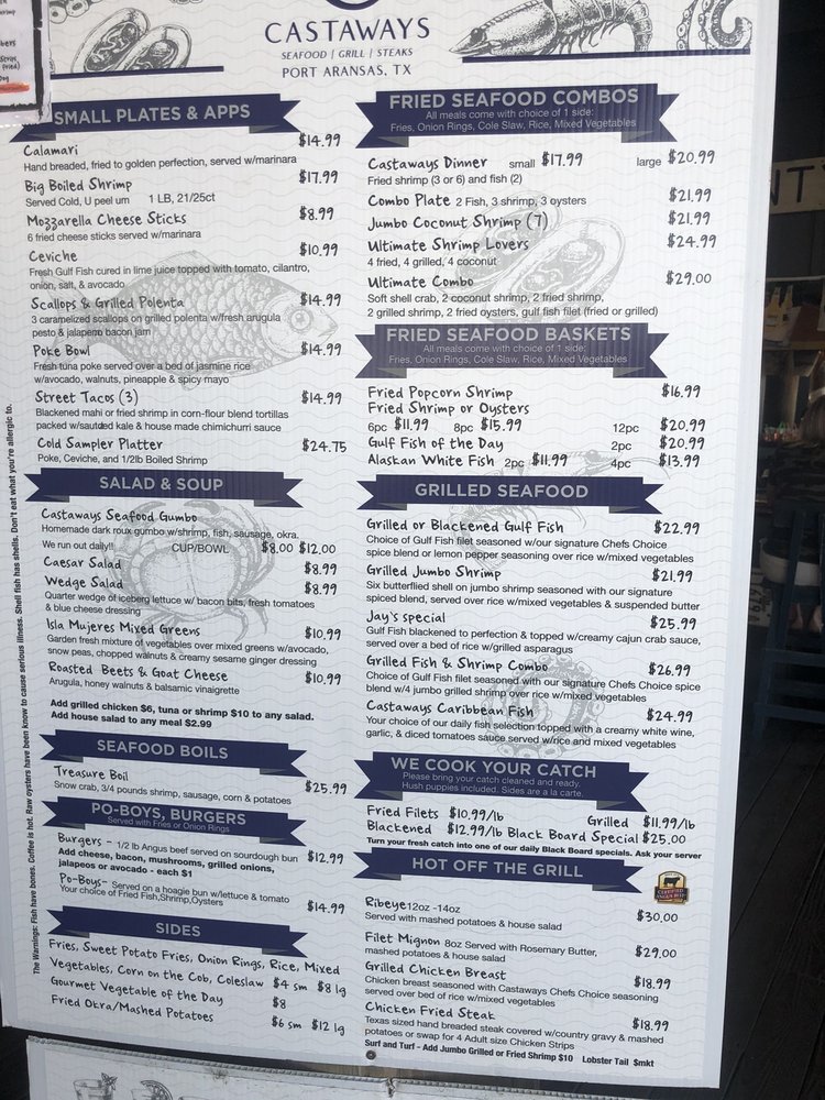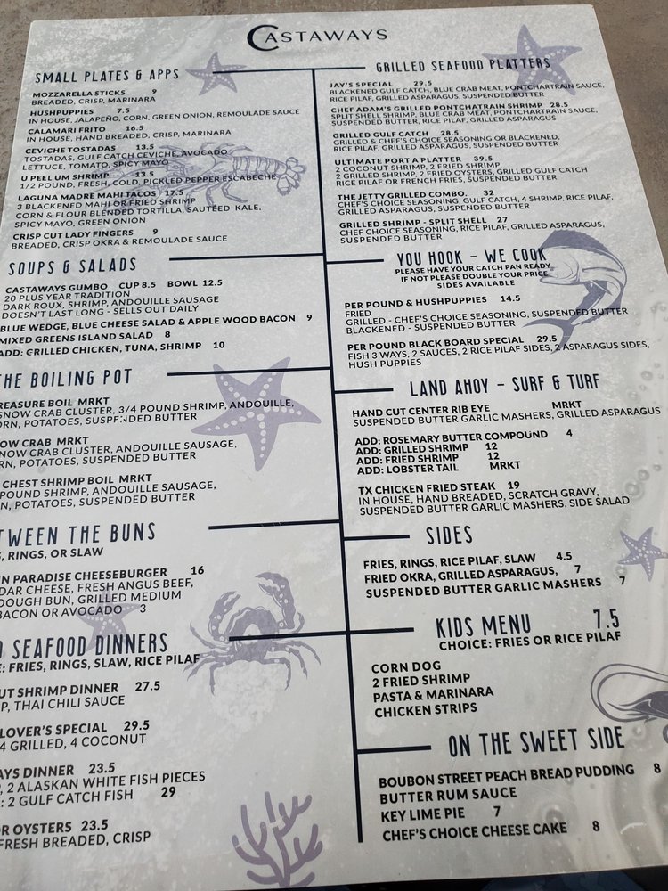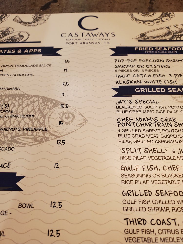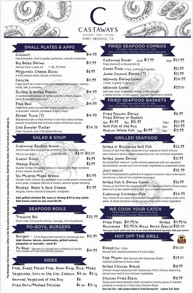 Castaways Seafood & Grill offers a diverse menu featuring salads, burgers, and seafood. Located in Port Aransas, TX, the restaurant provides various amenities such as takeout, delivery, and wheelchair accessibility. Their appetizers include crab cakes, fried clam strips, and coconut shrimp. The menu also offers soups, salads, and options for kids. Customer reviews highlight the delicious dishes like chicken fried steak, red fish, and crab legs. The attentive service and welcoming staff contribute to a pleasant dining experience. With a relaxed ambiance and a full bar, Castaways Seafood & Grill is praised for its flavorful food and outstanding service, making it a go-to spot for locals and visitors alike.