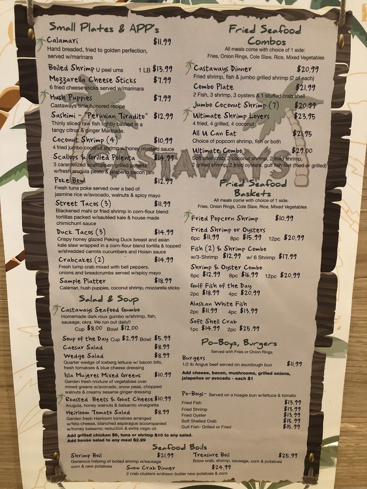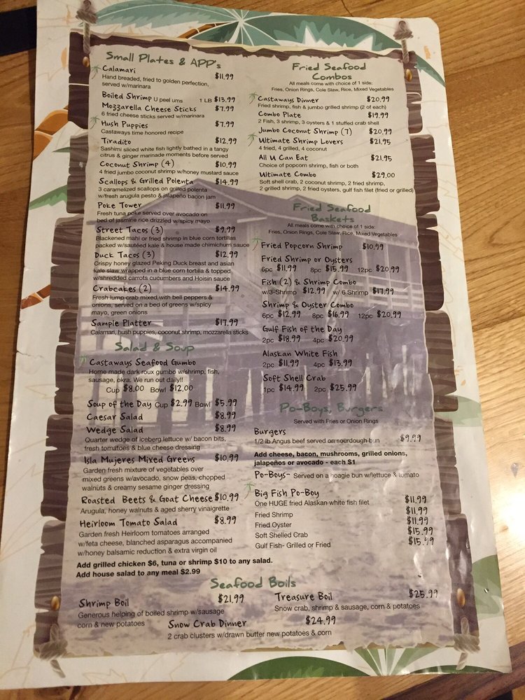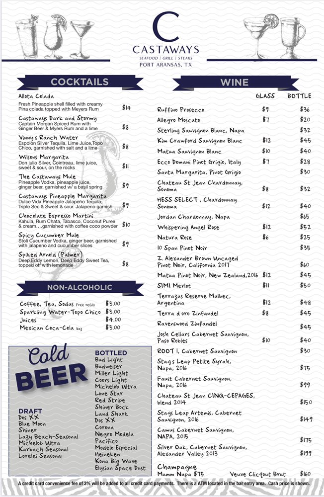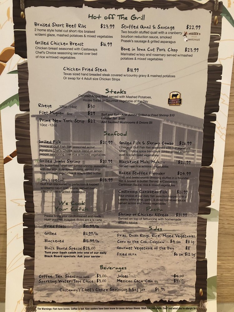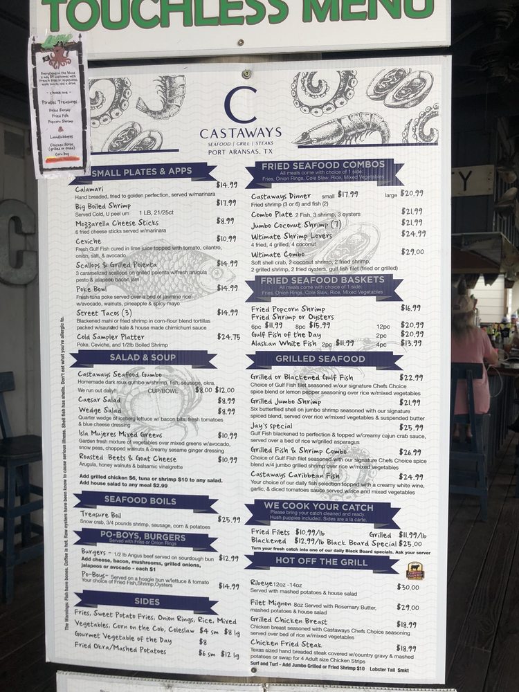 Castaways Seafood & Grill offers a diverse menu featuring salads, burgers, and seafood. Located in Port Aransas, TX, the restaurant provides various amenities such as takeout, delivery, and wheelchair accessibility. Their appetizers include crab cakes, fried clam strips, and coconut shrimp. The menu also offers soups, salads, and options for kids. Customer reviews highlight the delicious dishes like chicken fried steak, red fish, and crab legs. The attentive service and welcoming staff contribute to a pleasant dining experience. With a relaxed ambiance and a full bar, Castaways Seafood & Grill is praised for its flavorful food and outstanding service, making it a go-to spot for locals and visitors alike.